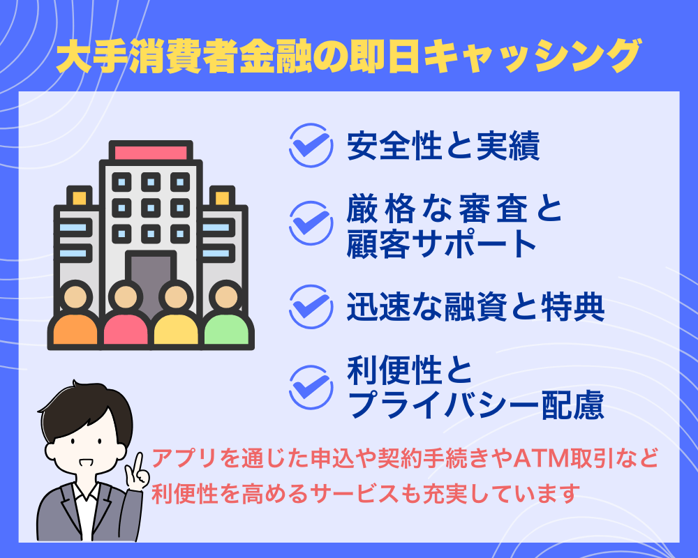 消費者金融業界における大手各社は、長年の実績と豊富な融資実績を活かし、安全性の高い即日キャッシングサービスを提供しています。